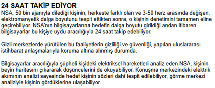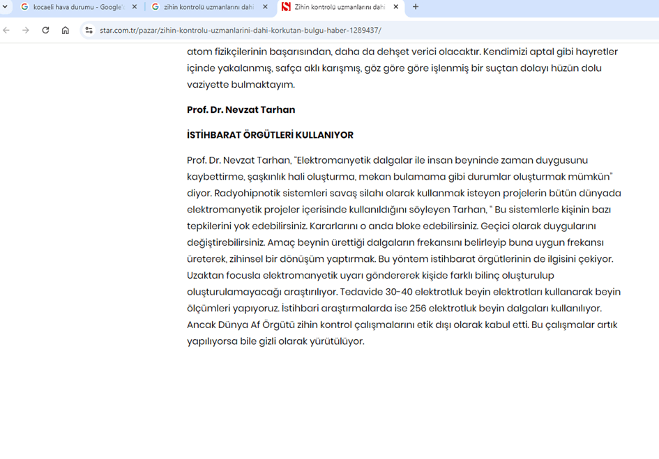 Star gazetesi haberinde Prf. Nevzat Tarhan da Elektromanyetik Dalgalarla beyindeki EEG sinyallerini kopyalayıp bilgisayara aktarılabileceğini belirtmektedir. Benim 3 dakikalık kaza namazımı bana 30 dakikada kıldırdılar, ben hiçbir şey fark etmedim, kol saatime bakınca 30 dakika sürdüğünü anladım, bu 30 dakikada ne olduğunu hiç bilmiyorum. Bu zaman işkencesini banyo süremi, yemek yeme süremi, dua süremi uzatarak da yapıyorlar, kendi günlük hayatımı bana zehir ediyorlar, inanınki banyo etmeye korkuyorum sürekli zamanı uzattılar mı diye korku içinde endişe içinde yaşamaya çalışıyorum. Neler çektiğimi bir ben biliyorum ve bir de ALLAH biliyor. Kobaya kendi günlük hayatını zehir etmek için her işkenceyi her zulmü deniyorlar.
