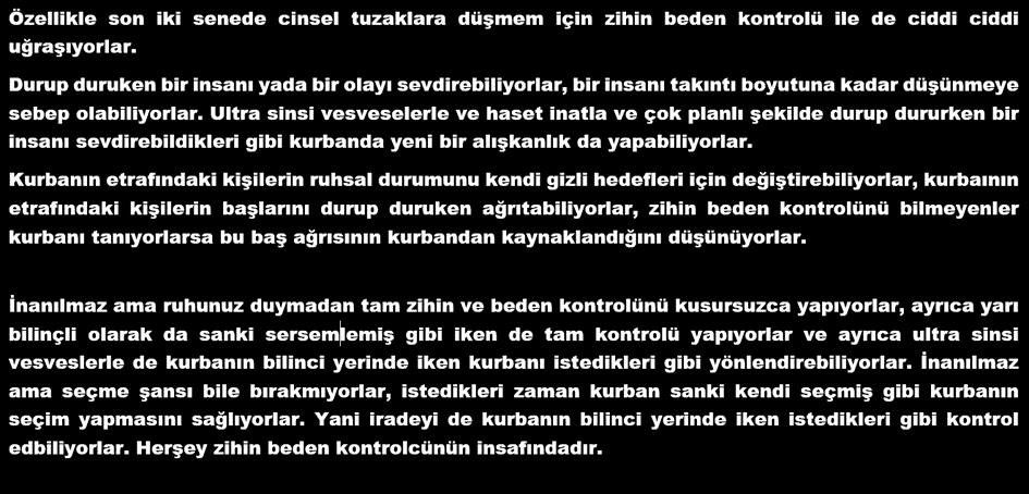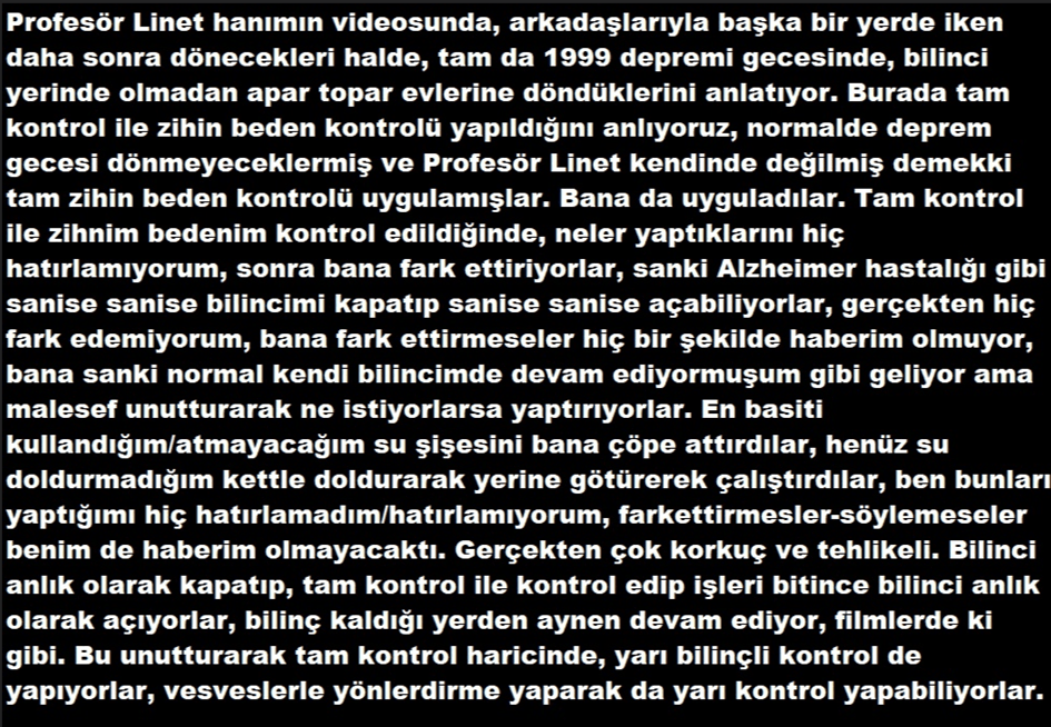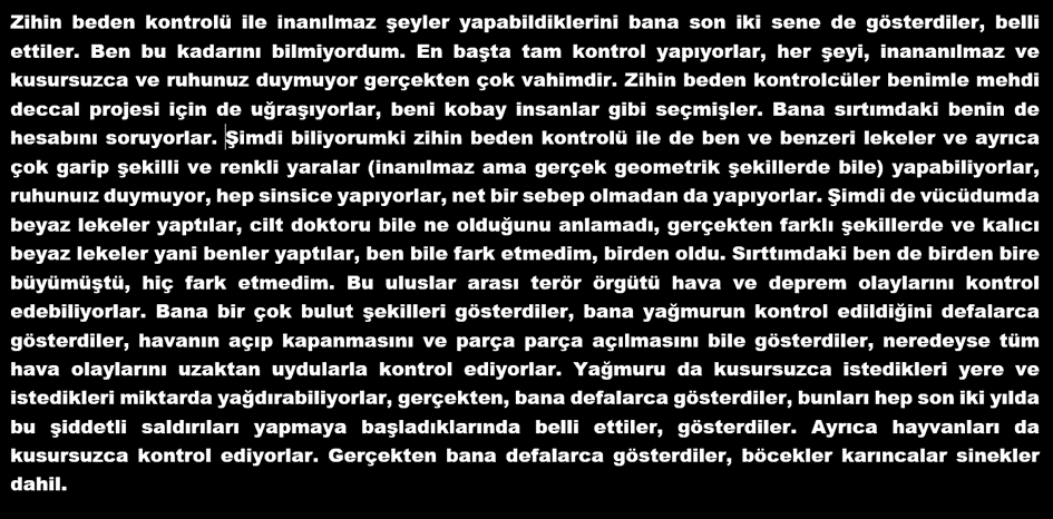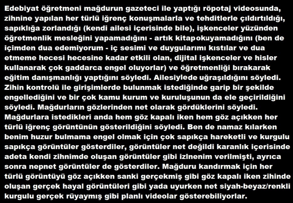 - ilk başlarda beynin diğer insanlardan çok farklı ışık ışıl parlıyor, sen çok mutlusun, sen farklısın diye de çok kandırdılar, sonra yazılım ile sana neler yapabildiğimizi göstermek istiyoruz diye bana ecel terleri döktürdüler, yazılım farklı komutlarını her defasında başka bir işkence ve düşünce işkencesi olarak kullandılar, bu zihin kontrolünün ultra (ötesi yok) olduğunu ve gerçek yalan makinesi olduğunu söylediler, bana algımı bozacak başımda yük varmış gibi bana sıkıntı verecek işkenceyi 2 yada 3 gün sürdürdüler, çok çok kötüydü, akşam namazını kılarken bu sıkıntı sinyalini kaldırdılar ve ben “aman Allah’ım dünya varmış, bana uzaktan ne acılar çektiriyorlar Rabbim” diyerek dakikalarca hüngür hüngür ağladım, bu uzun ağlayışıma bile acımadılar işkencelere ve zulümlerine farklı taktiklerle devam ettiler,