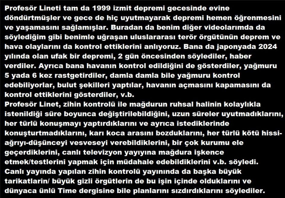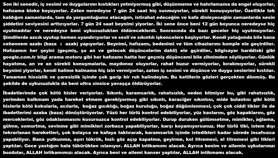 2021 yılında zihin kontrolü ile bir ay önce, annemi öldüreceklerini, çok gaddar ve katilce ciddi ses tonuyla söylediler ve bende 1 hafta sonra çaresizce savcılığa suç duyurusunda bulundum. İşkenceleri daha da arttırdılar ben de korkarak tek olarak kaldığım dairemden ayrılıp garip annemin yanına sığındım. Burada da gaddarca işkencelerine garip annemin yanında, onu bile kullanarak utanmadan gaddarca devam ettiler ve yaklaşık 2 hafta sonra da annemi epilepsi gibi nöbet geçirterek öldürdüler. Yaklaşık 1 ay önce dediklerini yaptılar. Annemin öldürülmesinde de çok garip rastlantılar, saldırılar ve çok çok gaddarlıklar yaptılar ama yazmak istemiyorum. Garip Anneme acımadılar, bana hala acımıyorlar. ALLAH bu sinsilerden, bu katillerden benim masum ve garip annemin intikamını alacak. Ben inanıyorum. Rabbim görevleri suçu bitirmek olupta tüm bu suçları bitiremeyen insanlara, görevleri adaleti sağlamak olupta tüm bu suçları devam ettiren insanlara, bu suçu bu suçluları bilipte ihbar etmeyen insanlara, bu suçu işleyen insanlara bu suçu işleten insanlara, ben ve öz ailem hariç tüm bu insanlara ben ve öz ailem hariç annemin ölümüne sebep olan insanlara, ben ve öz ailem hariç annemin ölümüne sevinen insanlara, bu suçlulara bu sinsilere bu zalimlere bu hasetlere kat kat lanet et Rabbim kat kat lanet et ALLAH’ım. Rabbim ben ve öz ailem hariç tüm bu insanlara, tüm bu zalimlere, tüm bu inatçı zorbalara, anneme acımayan bana acımayan bu insanlara, tüm hayatım boyunca insafa ve vicdana gelmeyen bu insanlara, 45 yıllık hayatım boyunca bu suçu her türlü kalıcı bitirmeyen bu insanlara, tüm bu suçlulara, tüm bu sinsilere, özellikle de benimle annemle öz ailemle zihin beyin beden kontrolü ile uğraşan insanlara, özellikle de benimle annemle öz ailemle yataklarımızda bile, kendi evlerimizde bile sinsice uğraşan insanlara, benim annemin ve öz ailemin uykularımızı bozan bu insanlara, ben ve öz ailem hariç bu insanlara, bu psikopatlara, bu sapıklara, bu hırsız arsız katil insanlara, bu hasetlere, arpaları fazla dertleri az gelen bu insanlara, annemin tüm hastalıklarını tüm dertlerini tüm sıkıntılarını misli ile ver Rabbim. ALLAH’ım ben ve öz ailem hariç tüm bu zalimler, tüm bu katiller annemden daha beter aciz ve çaresiz ve hasta ve dertli ve sıkıntılı olsunlar.