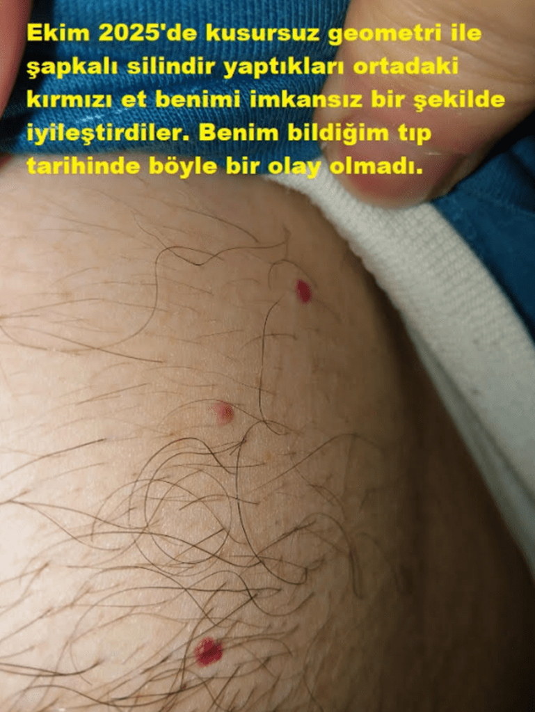 Ekim 2025’de ise kusursuz geometride şapkalı silindir yaptıkları kırımızı beni eski haline küçülttüler, eski haline getirdiler. Ben tarihde böyle bir olay duymadım, görmedim, inanınki ben kırımız et benini hiç ellemedim, kurcalamadım, eğer kurcalmış olsaydım asimetrik olarak büyümesi ve belkide kansere dönüşmesi ve hiç iyileşmemesi gerekirdi. Daha ne diyeyim. Gerçekten bana bunu onlar söylediler ve onlar söyledikten sonra yaptılar, asıl dikkat çekilmesi gereken şey budur, onlar söylediler ve sonrasında yaptılar, yani net olarak onlar yaptı. yoksa ben bedenimi neredeyse hiç incelemiyorum bile.