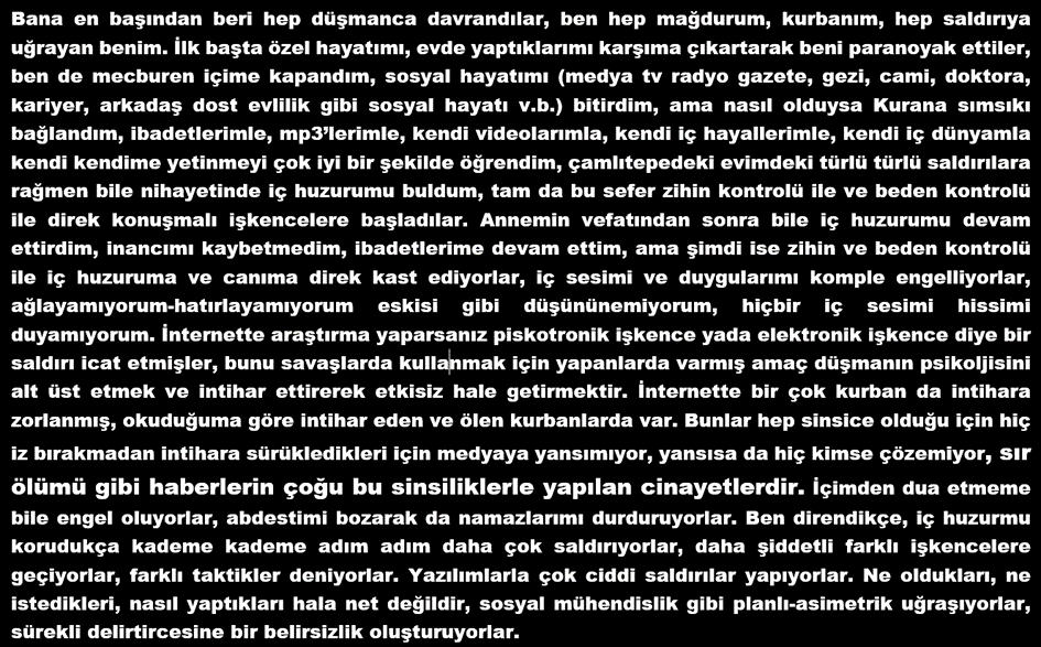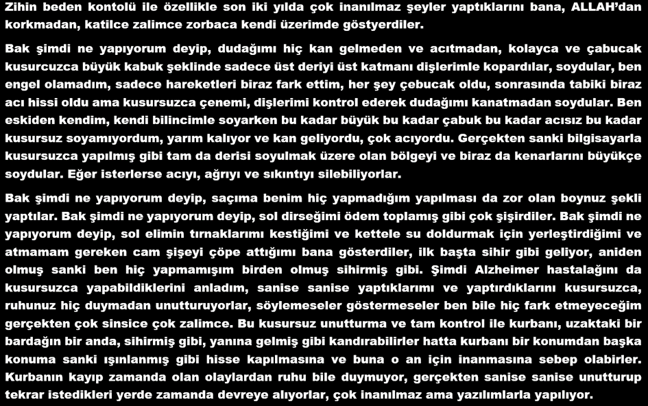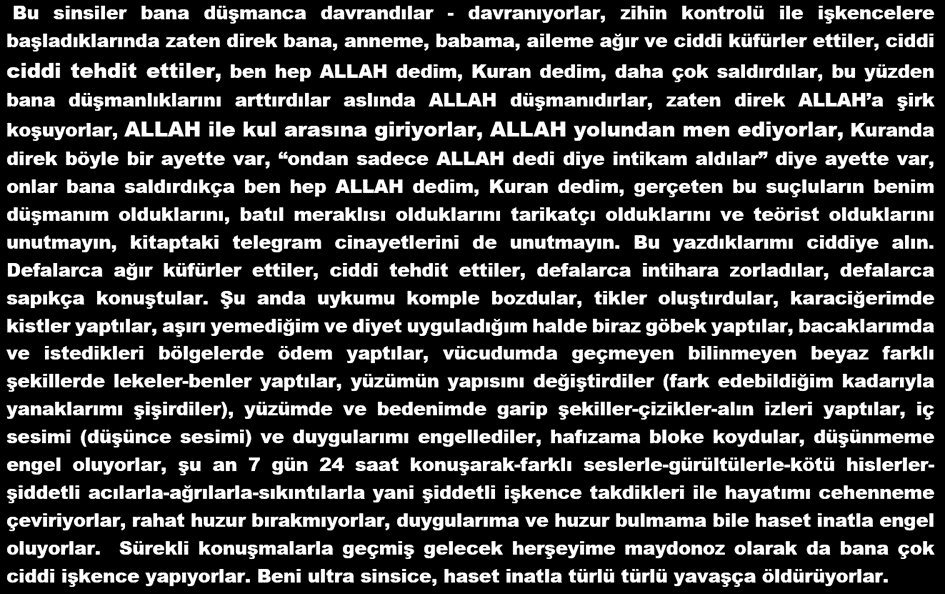 İnanılması çok zor ama bilim kurgu ve batıl konulu çoğu filmden beter bir şekilde işkence altındayım. Tamamen benim, iznim ve rızam ve iradem dışındadır, zorbaca ve katilcedir. Benim aklım almıyor, özellikle de haset inadı aklım almıyor, bu devamlı türlü türlü sinsice gaddarca uğraşmayı ve bu suçu ultra sinice devam ettirmelerini, bitirmemelerini. Ama direk benim bedenim üzerimde direk benim zihnimde bana uygulamalı olarak gösteriyorlar. Gerçekten çok zor dayanıyorum, başkası olsa şimdiye kadar çoktan intihar etmişti, ben ALLAH’a sığınmaya çalışıyorum.