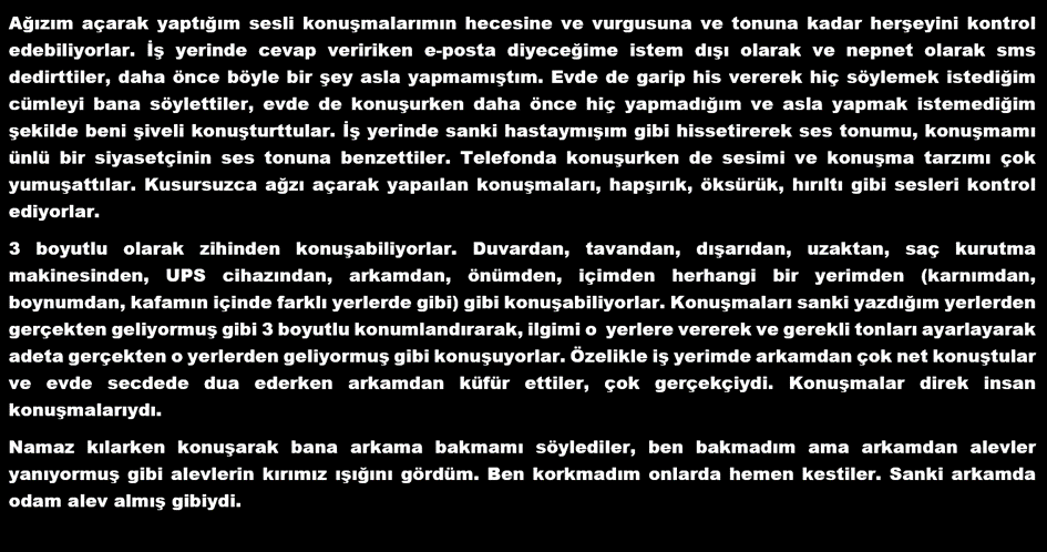 - ilk başlarda gerçek adam sesleri ile konuştular, aynı anda birden çok kişi de konuştu, ben hep sadece dinledim, dinlemek zorunda kaldım çünkü kaçışı kurtuluşu yoktu, toplu konuşmalarında çok farklı taktikler kullandılar, konuşma işkencesi yaparken aniden yaşlı babacan bir adam “bunların hepsi deli” diyordu, çok sonraları da konuşma ve diğer zulümlerle birlikte işkence yaparken tatlı kadın kız sesleri ile sanki bana yardım eder sanki benim iyiliğime konuşuyormuş gibi araya serpiştiriyorlar, o ağır konuşmalı ve zulümlü işkenceler arasında böyle tatlı konuşmalar daha çok etkili oluyor ve ilgim yeniden konuşmalara yöneliyor, şimdi anladım ki bu da bir taktikmiş, ben konuşmalardan haliyle sıkılınca yani ilgim azalınca benim ilgimi yeniden kendilerine çekmek içinmiş ve beni bir iyi bir kötü varmış gibi kandırmak ve beni bununla meşgul etmekmiş, yani bu düşünceye kanıp kendimce şu ses iyi diğeri kötü diye kendi kendime dakikalarımı harcamamı istemişler yani beni günlük hayattan alarak beni delirtmek istemişler, inanınki ben bu tuzağa düşmedim, ben ne olursa olsun hep çaresizce katlandım, sabrettim, izin verdikleri ölçüde günlük işlerime, namazlarıma devam ettim,