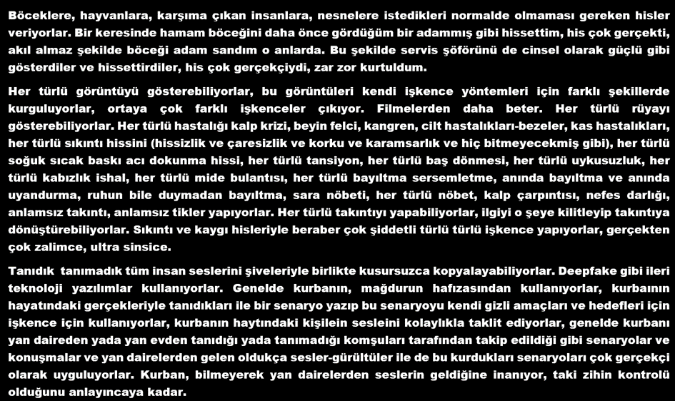- sonra çok gerçekçi kadın sesiyle uzun süre işkence yaptılar, sapık ve psikopat ve katil kadın tam da ben yemek yerken bana pislik yedirdi, ben ekmeği ağzıma atarken bana “aç bakalım ağzını pislik-b.k geliyor” dedi, hatta tam lokmalarımı yutarken leş geliyor hatta ALLAH’tan korkmadan canım annemi etini bile kullandı, çok iğrenç ve insanlıktan uzaktı, en sonunda da ölü eti yemiş gibi ağzımda yağlı bir hisle bana kendince ölü eti yedirdi, o an katı yağ hissi çok gerçekti ve konuşmayla söylediği şeyi de ister istemez oraya bağlıyorsunuz, o an gerçekten o kötülüğü yaşamış gibi hissediyorsunuz, bu şekilde yemeklerimi zehir ettiler, bu kadın kendine eski katilleri de alarak, eskiden konuşan adam sesleri ile de toplu saatler süren konuşma ve pislik yedirme işkenceleri de yaptılar, eskiden konuşan sert kötü ses tonu ile gece bana “cihat bizim liderimiz olur musun” diye bu ses sanki çocuklaşmış gibi yumuşatarak sordular ben yine sadece dinledim ve uyumaya çalıştım yine bu sefer de utanmadan “kahhar kahhar sana” dedi eski sert kötü tonuna dönerek, kendince beni umdurup beni kahhar yaptı, daha neler yaptılar da yazamıyorum.