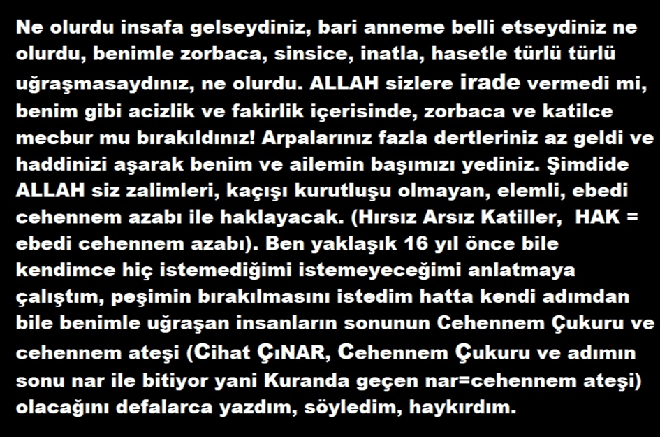 Gerek zihin kontrolü ile uzaktan benimle uğraşan insanlar gerekse casusluk aygıtlarıyla benimle uğraşan, takip eden insanlar ve bu şekilde sinsicei zorbaca beni takip edip de beni, annemi üzen veya rahatsız eden insanlar, sizler karaktersiz aşağılık zorbalarsınız, insanlıktan nasibinizi almamışsınız dertleriniz fazla arpanız az gelmiş de benimle ve garip annemle sinsice hasetle inatla uğraştınız. DARPA ilk başta ARPA diye adlandırılıyormuş, zihin kontrolünün DARPA tarafından da yapıldığı söyleniyor. Ben hep bu sinsi insanların ARPAları fazla dertleri az geldiği için kendilerini bırakıpta başkalarının hayatlarına (canlarına, başarılarına, mallarına, namuslarına, bedenlerine…) kast ettiklerini düşünüyorum, biliyorum. Kendilerini fakir olarak görüpte bizim arpamız az, paramız az deyip bu suçu işleyen ve bu sözümü üzerine alınmayan sinsi insanlar, sizin paranız başkalarınkine göre az olabilir ama dertleriniz az geldiği kesindir, ALLAH garip annemin tüm dertlerini tüm sıkıntılarını tüm hastalıklarını tüm acizliklerini siz, sözde fakirlere versin de görün bakalım, derdiniz azmıymış çokmuymuş. ALLAH garip annemin intikamını bu suça, bu sinsiliğe bu hasetliğe, bu hırsız arsız katilliğe az yada çok bulaşan herkesten alacak, zengin yada fakir olsun, suç suçtur, kötülük kötülerdendir, bu kesindir. Ben ortaokulda parasızlıktan dershaneye gidemedim, bunu sinsice fırsat bilen fe.,töcü abiler (suçlular) beni defalarca hem de kışkırtmalı bile çağırdılar ama ben hiç biz zaman gitmedim, kimseye ne olduğu belli olmayan bu suçlulara hiç bulaşmadım. Lisede dershanede en başarılı sınıfta yani elit sınıfta olduğum halde her ay beni dersin ortasında muhasebeye çağırırlardı, arkadaşlarım bana acıyıp cihat bu ayki dershane paranı ben verebilirim sorun değil diye bile söylüyorlardı ama ben kimseden almadım ve geç de olsa ödedim. Üniversitede parasızlıktan kırılan dereceli gözlüğümü günlerce kullanmak zorunda kaldım, alay bile ettiler ama umursamadım, sabrettim. Tüm bu fakirliklere rağmen ben bir an bile yasadışı bir şeye bulaşmadım, kimseye kıskançlıkla bakmadım, aşağılık kompleksine kapılmadım, ben fakirim diye kompleks hiç yapmadım, Rabbime ve daha çok çalışmaya daha çok özveriye sığındım ve sonunda başardım. Elektrik Elektronik Yüksek Mühendisi oldum. Ama siz sinsiler, sizler benim kul hakkımı yediniz. Benim fedakarlıklarla dolu, çilelerle dolu, zorluklarla dolu hayatımı daha da zorlaştırdınız. Kendimi ve garip annemi ve kardeşlerimi sonunda kiralarda sürünmekten 2 küçük dairecik alarak kurtardım ama siz her ikisini de bana da, garip anneme de, aileme de zehir ettiniz. Hayatımı alt üst ettiniz hırsız arsız katiller.