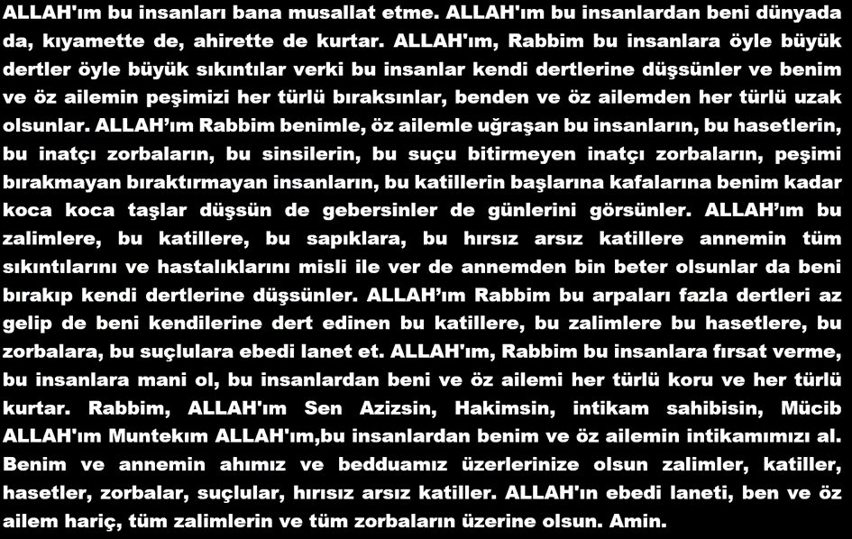 Yüce ALLAH’ım, Yüce Rabbim, yalvarırım Rabbim, ben ve öz ailem hariç, tüm sinsi insanları, tüm hased insanları helat et, tüm bu insanları kuşatıcı ve kaçışı kurtuluşu olmayan cehenneme ebediyen mahkum et Rabbim, tüm bu insanları helak et Rabbim, intikamımı al Rabbim, garip annemin de intikamını al Rabbim. Sana sığındım Rabbim, Sen her şeyden haberdarsın, Rabbim. Amin.