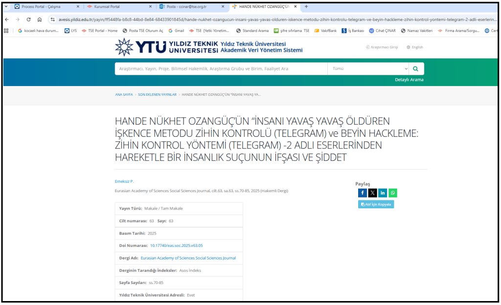 Yıldız Teknik Üniversitesi Öğr. Gör. Dr. Pelin EMEKSİZ, aşağıda verilen resmi makalesinde, bana uygulanan, kobayın/mağdurun hayatını çekilmez kılıp intihara sürüklemek için yavaşça öldüren işkenceleri biraz anlatmıştır. Bu resmi makalesinde HANDE NÜKHET OZANGÜÇ’ÜN “İNSANI YAVAŞ YAVAŞ ÖLDÜREN İŞKENCE METODU ZİHİN KONTROLÜ (TELEGRAM) ve BEYİN HACKLEME: ZİHİN KONTROL YÖNTEMİ ile mağdur ve yazar Hande Hanımın kitabından faydalanmıştır. Dr. Pelin EMEKSİZ hanım eğer bilimsel olarak ikna olmasa idi yani inanmasa idi böyle resmi bir makale yazmazdı, demek ki bilim insanı Dr. Pelin EMEKSİZ kendince inandı ve bu sayede Yıldız Teknik Üniversitesinin resmi sitesinde makalesini yayınladı.